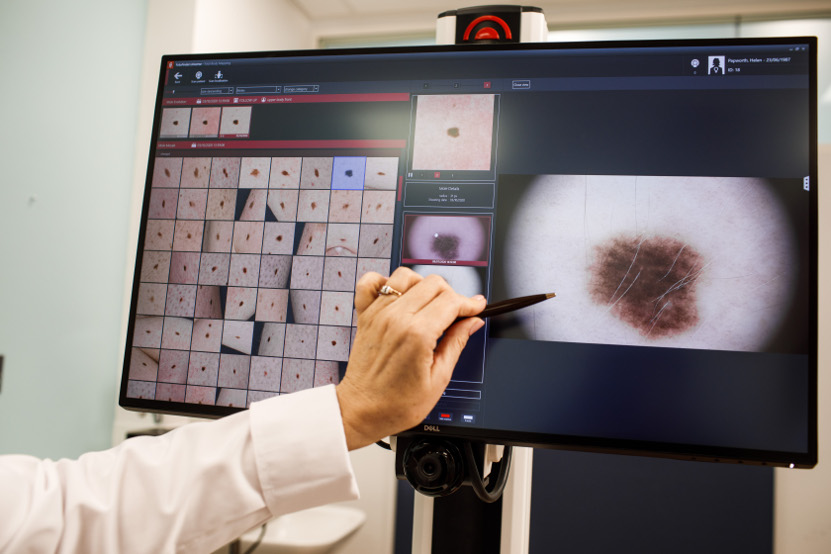 Follow-up photographs acquired using the FotoFinder® Master system are meticulously compared to the baseline images to identify any changes in size, colour, border, or shape of existing moles.